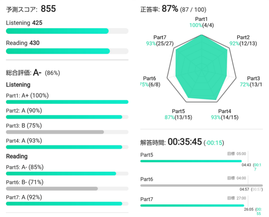 普段問題を解く際には1問から解くことができるので、集中して取り組むことができます。その一方で、本番よりも集中して問題を解いた結果のスコアなので、実際のスコアより高く出てしまっていると思いました。正確な実力を測るなら、後述するTOEIC模試の方が正確なスコアが出ます。
